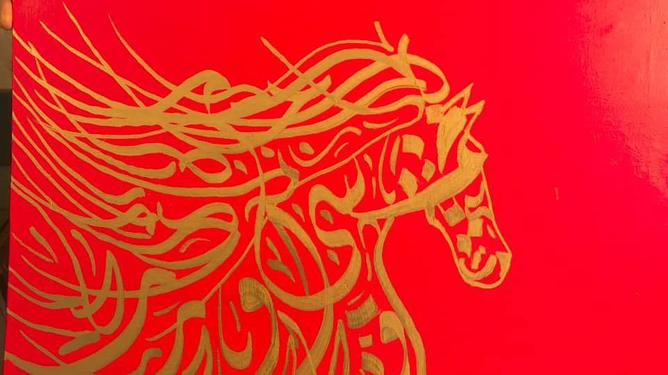 وأضاف ناصر بأنه في هذه المناسبة المفعمة بالجمال، وظّف الحرف العربي في تشكيل صورة الحصان بوصفه عنصراً تشكيلياً، حيث لا تُقصد الكلمات للقراءة، بل تُستحضر لقيمتها الجمالية والرمزية، ويذوب الحرف في الشكل، ويتحوّل من لغة مكتوبة إلى بنية بصرية نابضة بالحركة، معبّرة عن القوة والديناميكية المرتبطتين برمز الحصان.