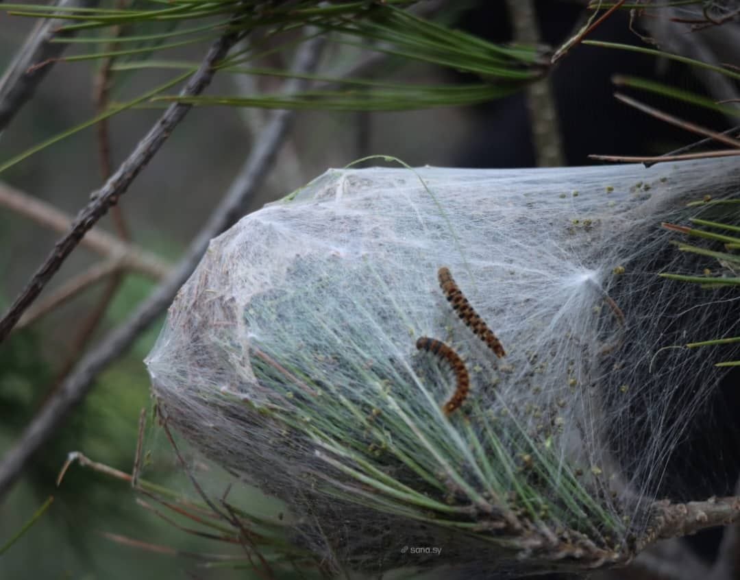 وبيّن أن هذه اليرقات تبني أعشاشاً حريرية تشبه أعشاش الطيور، تظهر بوضوح خلال شهري آذار ونيسان، وتمتاز بقدرتها على مقاومة الظروف الجوية القاسية. وتتغذى على أوراق الصنوبر، ما يؤدي في حالات الإصابة الشديدة إلى تعرية الأشجار بشكل شبه كامل.