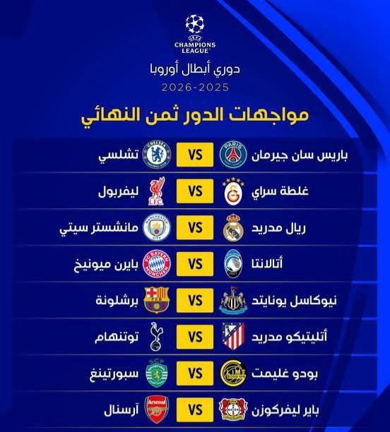 أسفرت قرعة الدور ثمن النهائي من بطولة دوري أبطال أوروبا بكرة القدم لموسم 2025 – 2026، والتي سُحبت أمس الجمعة في مقر الاتحاد الأوروبي لكرة القدم بمدينة نيون السويسرية، عن مواجهات نارية وقوية، وأبرزها لقاء القمة المبكرة بين ريال مدريد ومانشستر سيتي، فيما يواجه برشلونة فريق نيوكاسل يونايتد، ويلتقي باريس سان جيرمان مع حامل اللقب تشلسي، وبايرن ميونخ يلتقي مع فريق أتالانتا.