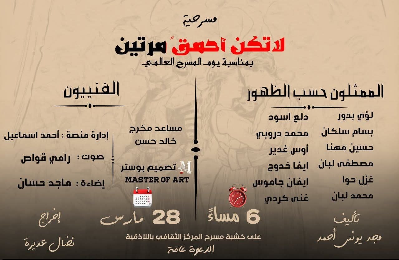 ضمن فعاليات يوم المسرح العالمي، وتحت رعاية مديرية الثقافة في اللاذقية، احتضن مسرح المركز الثقافي العرض المسرحي “لا تكن أحمق مرتين”، من إخراج نضال عديرة وتأليف مجد يونس أحمد.