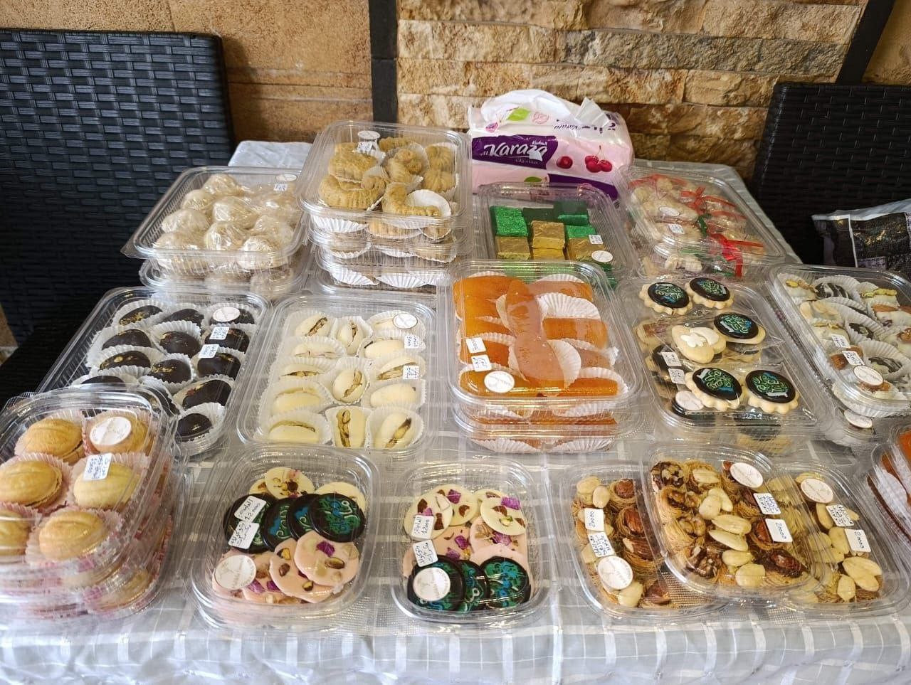السيدتان ماتيلدا حنا وغنوة نصور تميزتا بتحضير اللوزينا والكوكيز، إضافة إلى البيتفورات السادة والمحشية بأشكال مميزة محضرة بالزبدة الحيوانية، إضافة إلى الحلويات المخصصة لسوء الامتصاص المكونة من طحين الذرة.