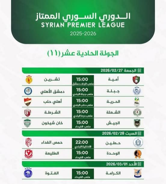 تفتتح اليوم الجمعة مباريات الجولة الحادية عشرة من الدوري السوري الممتاز بكرة القدم، حيث تقام خمس مباريات، وتنتظر فريقي تشرين وجبلة مباراتان قويتان، فيما يتصدر لقاء ديربي حلب مباريات اليوم.