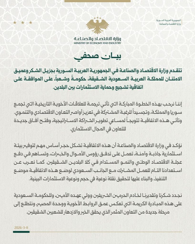 وجاء في نص البيان: “إننا نرحب بهذه الخطوة المباركة التي تأتي ترجمة للعلاقات الأخوية التاريخية التي تجمع سوريا والمملكة، وتجسيداً للرغبة المشتركة في تعزيز أواصر التعاون الاقتصادي والتنموي. وتأتي هذه الاتفاقية تتويجاً لمساعي تطوير الشراكة الاستراتيجية، وفتح آفاق جديدة للتعاون في المجال الاستثماري”.