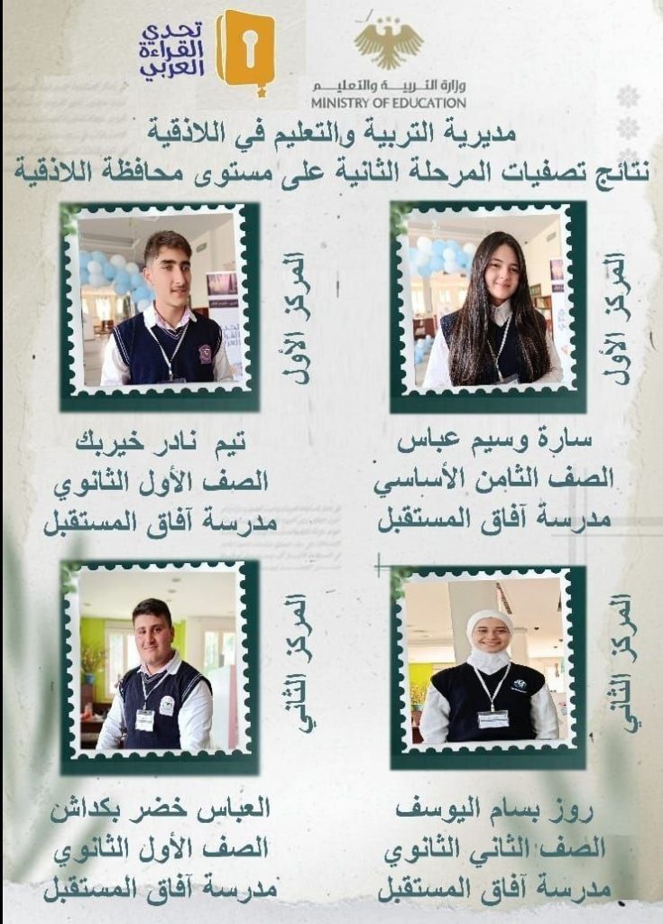 وكان قد تأهل 162 طالباً وطالبة لخوض المرحلة الثانية من مسابقة “تحدي القراءة العربي” من 60 مدرسة في محافظة اللاذقية، فيما يستعد المتأهلون لخوض المرحلة الثالثة من المسابقة على مستوى الجمهورية العربية السورية.
