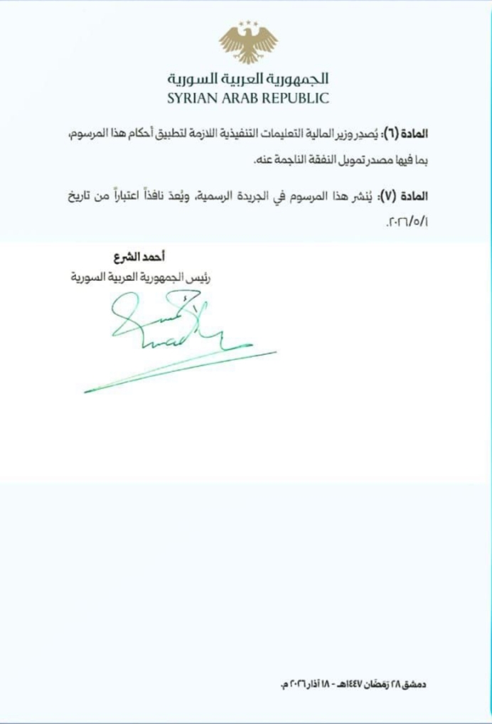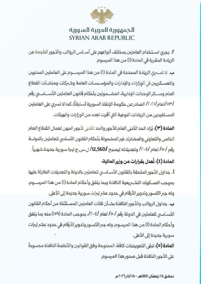 في مكرمة منه وبمناسبة عيد الفطر السعيد، أصدر السيد الرئيس أحمد الشرع المرسوم رقم (67) لعام 2026 القاضي بإضافة نسبة 50 بالمئة إلى الرواتب والأجور المقطوعة لكل من العاملين في الوزارات والإدارات والمؤسسات العامة والشركات ومنشآت القطاع العام وسائر الوحدات الإدارية وجهات القطاع العام، وكذلك القطاع المشترك التي لا تقل نسبة مساهمة الدولة فيها عن 50 في المئة.
