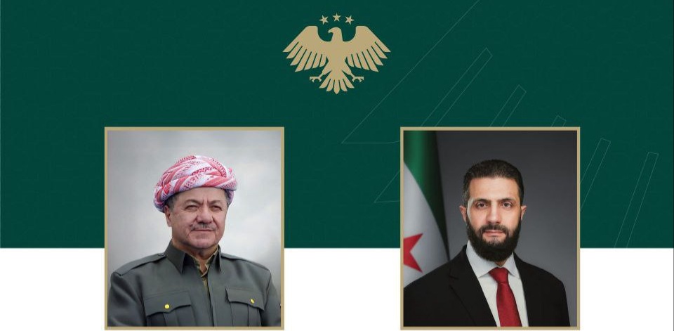 بحث السيد الرئيس أحمد الشرع في اتصال هاتفي مع رئيس الحزب الديمقراطي الكردستاني مسعود بارزاني التطورات الأخيرة في سوريا.