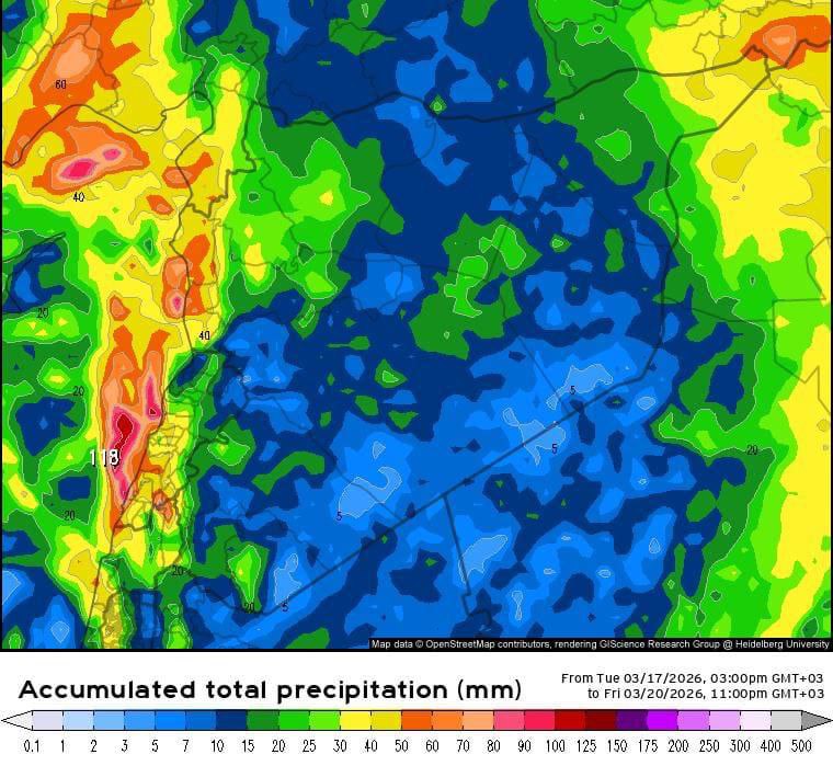 وحذرت دائرة الإنذار المبكر والتأهب في وزارة الطوارئ وإدارة الكوارث من أمطار غزيرة على مناطق الساحل وجبالها، إلى جانب حركة الرياح النشطة والقوية خلال فترة تأثير المنخفض.