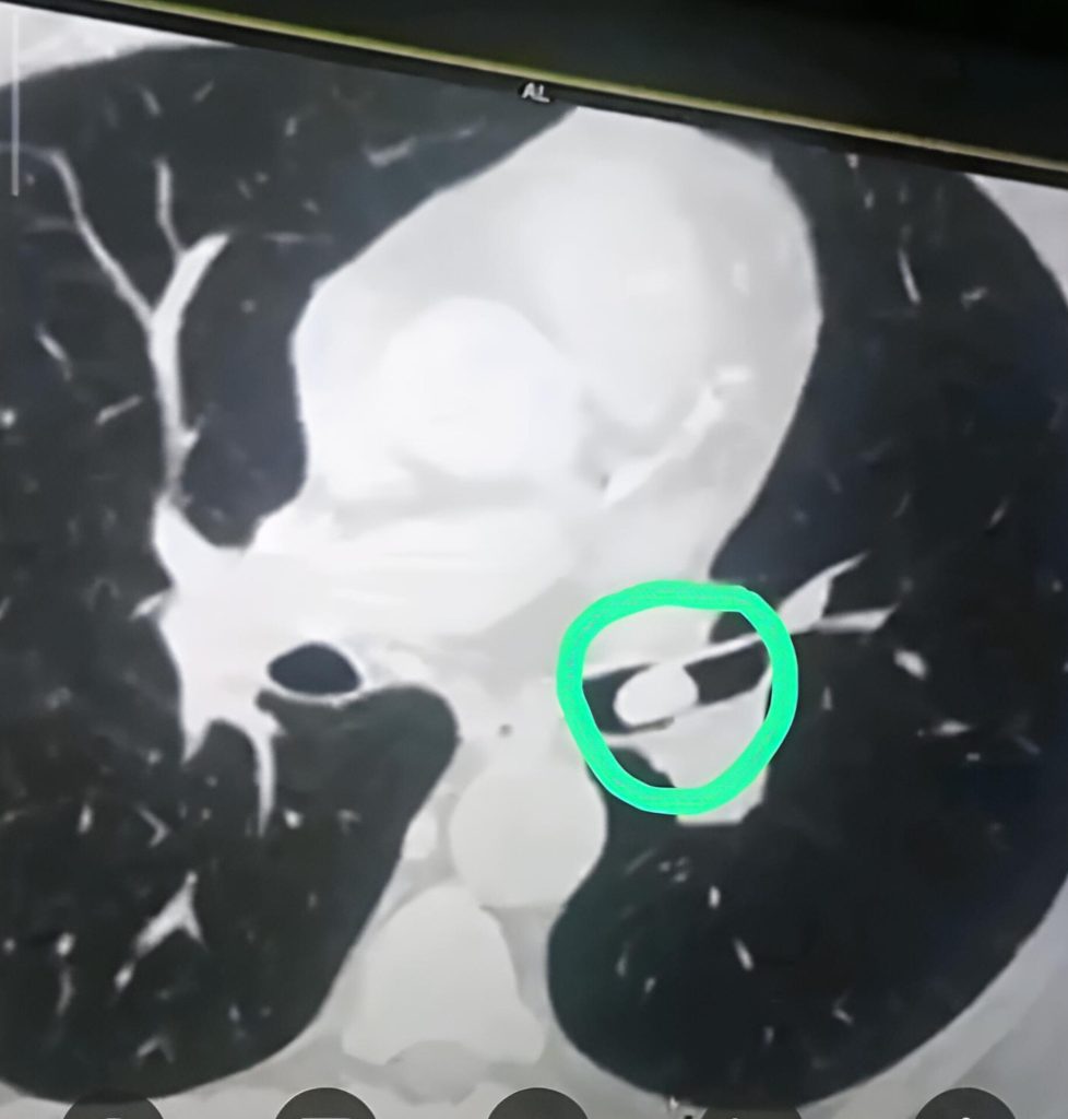وبحسب القصة المرضية، ذكر المريض أنه استنشق بذرة “أكي دنيا” قبل أكثر من عام ما ساعد في توجيه التشخيص، وأظهر تنظير الحنجرة الليفي المرن عدم وجود آفات حنجرية، في حين كشف الفحص السريري عن وجود وزيز في الجهة اليسرى من الصدر، وأكد التصوير الطبقي المحوري للعنق والصدر وجود جسم غريب عالق بعد التفرع القصبي الأيسر، متسبباً بانسداد جزئي في مجرى الهواء.