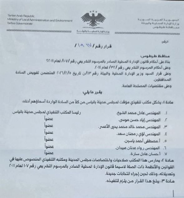 أصدر قرار يقضي بتشكيل مكتب تنفيذي مؤقت لمجلس مدينة بانياس، استناداً إلى أحكام قانون الإدارة المحلية الصادر بالمرسوم التشريعي رقم /107/ لعام 2011، وأحكام المرسوم التشريعي رقم /32/ لعام 2014، وقرار وزير الإدارة المحلية والبيئة رقم /13/ن تاريخ 5/2/2026، المتضمن تفويض السادة المحافظين، وذلك بناءً على مقتضيات المصلحة العامة.