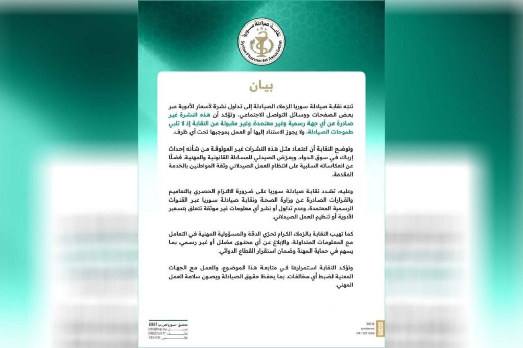 أصدرت نقابة الصيادلة في سوريا بياناً رسمياً أكدت فيه أن النشرة المتداولة عبر صفحات التواصل الاجتماعي بشأن أسعار الأدوية ليست معتمدة من قبل أي جهة رسمية، وأنها مرفوضة من قبل النقابة. كما حذرت النقابة من الاعتماد على هذه النشرة أو العمل بها تحت أي ظرف من الظروف.